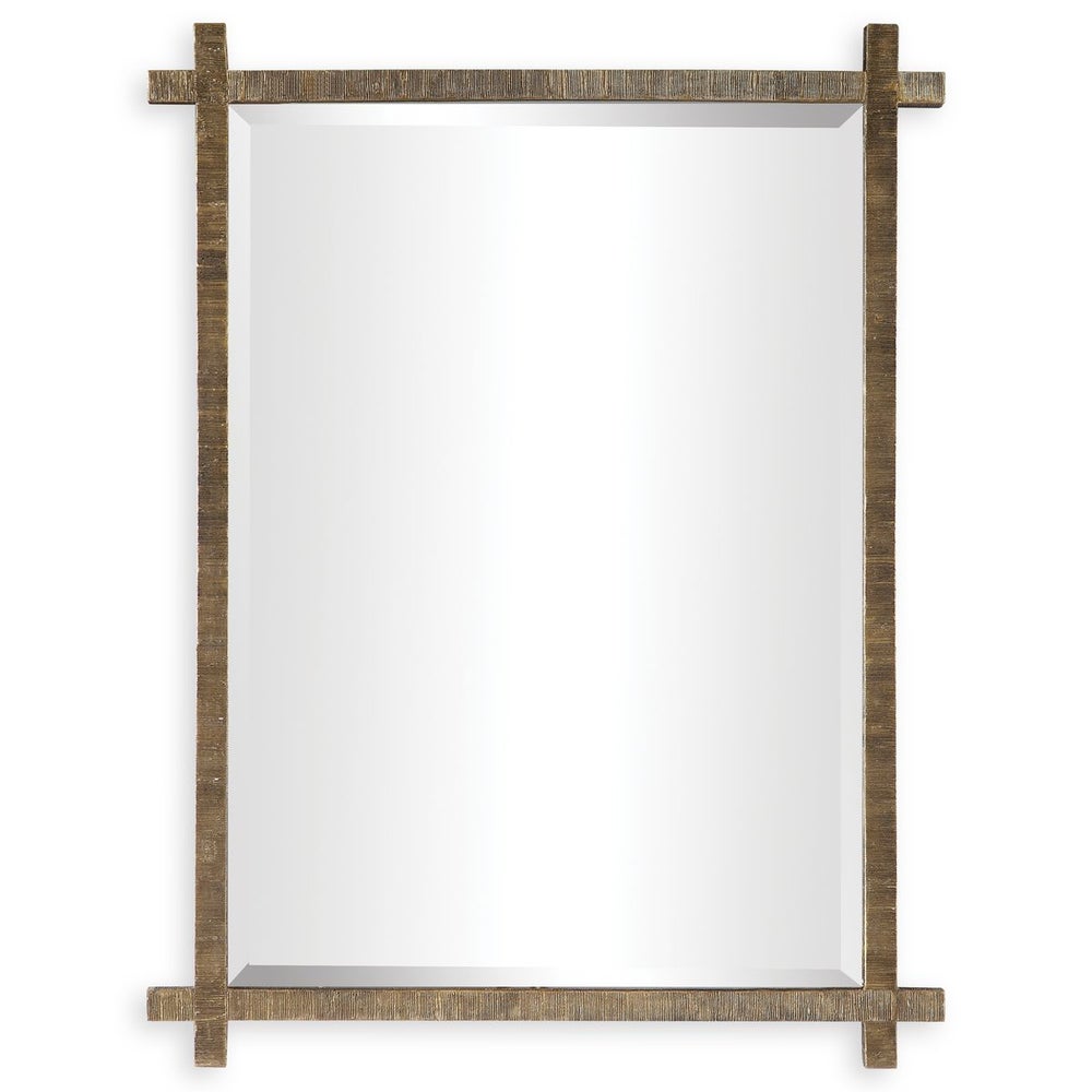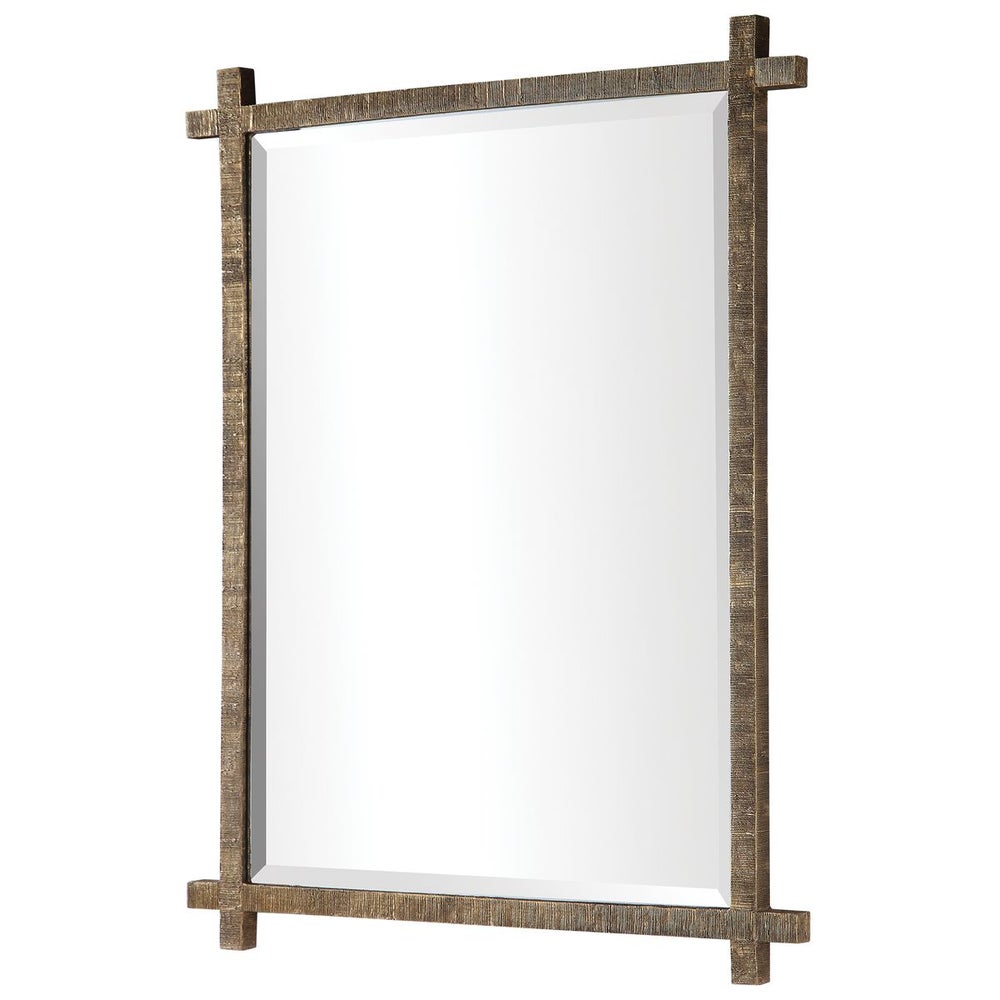 This mirror features an antique gold finished frame with ribbed texture, adding a tribal feel. The piece has a generous 1 1/4" bevel and may be hung horizontal or vertical.