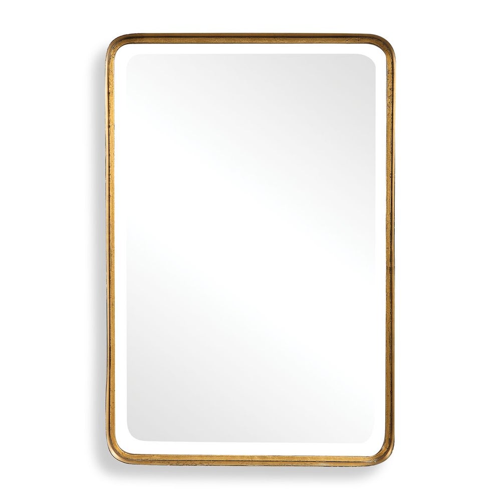This vanity mirror features a petite, yet deep metal band surrounding an offset inner ledge finished in a lightly antiqued gold leaf. Mirror has a generous 1 1/4" bevel and may be hung horizontal or vertical.