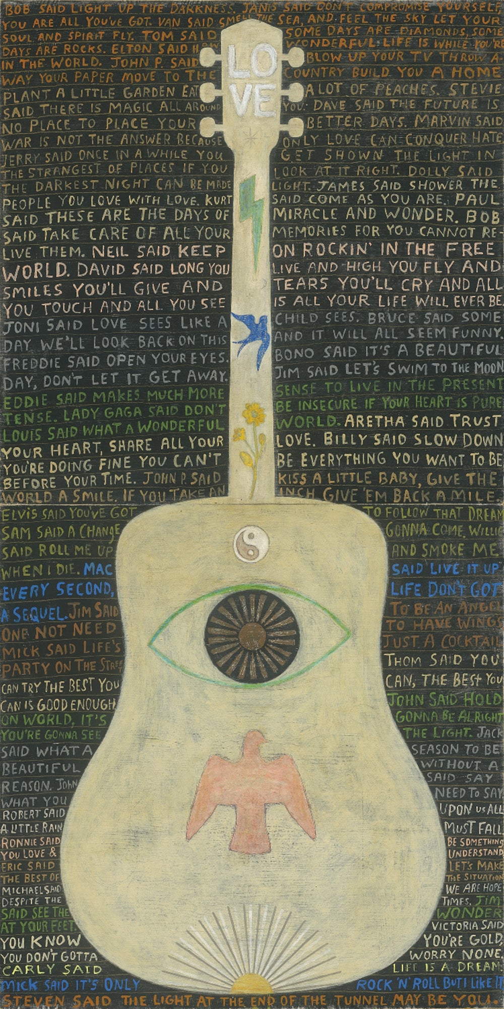 Bob said light up the darkness. Janis said don’t compromise yourself, you are all you’ve got. Van said smell the sea, and feel the sky let your soul and spirit fly. Tom said some days are diamonds, some days are rocks. Elton said how wonderful life is while you’re in the world. John P. said blowup your tv throw away your paper move to the country build you a home plant a little garden eat a lot of peaches. Stevie said there is magic all around you. Dave said the future is no place to place your better days. Marvin said war is not the answer because only love can conquer hate. Jerry said once in a while you get shown the light in the strangest of places if you look at it right. Dolly said the darkest night can be made light. James said shower the people you love with love. Kurt said come as you are. Paul said these are the days of miracle and wonder. Bob said take care of all your memories for you cannot relive them. Neil said keep on rockin’ in the free world. David said long you live and high you fly and smiles you’ll give and tears you’ll cry and all you touch and all you see is all your life will ever be. Joni said love sees like a child sees. Bruce said some day we’ll look back on this and it will all seem funny. Freddie said open your eyes. Bono said it’s a beautiful day, don’t let it get away. Jim said let’s swim to the moon. Eddie said makes much more sense to live in the present tense. Lady Gaga said don’t be insecure if your heart is pure. Louis said what a wonderful world. Aretha said trust your heart, share all your love. Billy said slow down you’re doing fine you can’t be everything you want to be before your time. John P. said kiss a little baby, give the world a smile. If you take an inch give ‘em back a mile. Elvis said you’ve got to follow that dream. Sam said a change gonna come. Willie said roll me up and smoke me when I die. Mac said live it up every second, life don’t got a sequel. Jim said to be an angel one not need to have wings. Mick said life’s just a cocktail party on the street. Thom said you can try the best you can, the best you can is good enough. John said hold on world, it’s gonna be alright you’re gonna see the light. Jack said what a season to be beautiful without a reason. John said say what you need to say. Robert said upon us all a little rain must fall. Ronnie said be something you love & understand. Eric said let’s make the best of the situation. Michael said we are hope despite times. Jim said see the wonder at your feet. Victoria said you know you’re gold, you don’t gotta worry none. Carly said life is a dream. Mick said it’s only rock ‘n’ roll but I like it. Steven said the light at the end of the tunnel may be you.
