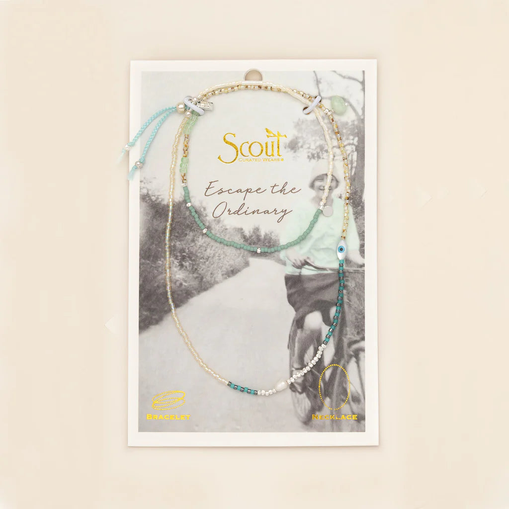 Hand strung with Japanese Miyuki Beads, organic pearls, and meaningful stones, each bracelet/necklace wrap comes packaged on a nostalgia-inspired postcard that celebrates life's journey & heartfelt connections.