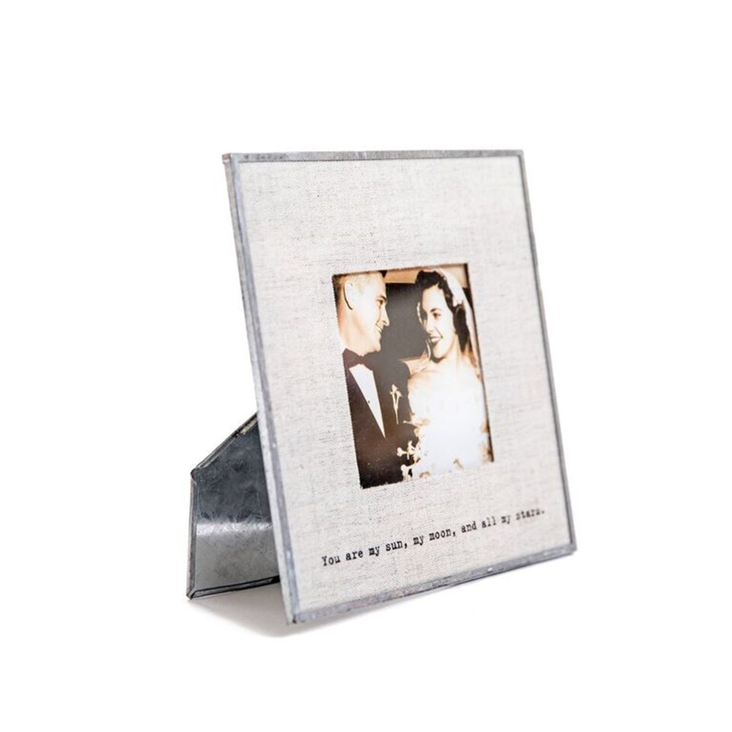 Metal photo frames come with a linen fabric and printed quote . Frame is 6" x 6" and fits 3.5" x 3.5" photo.