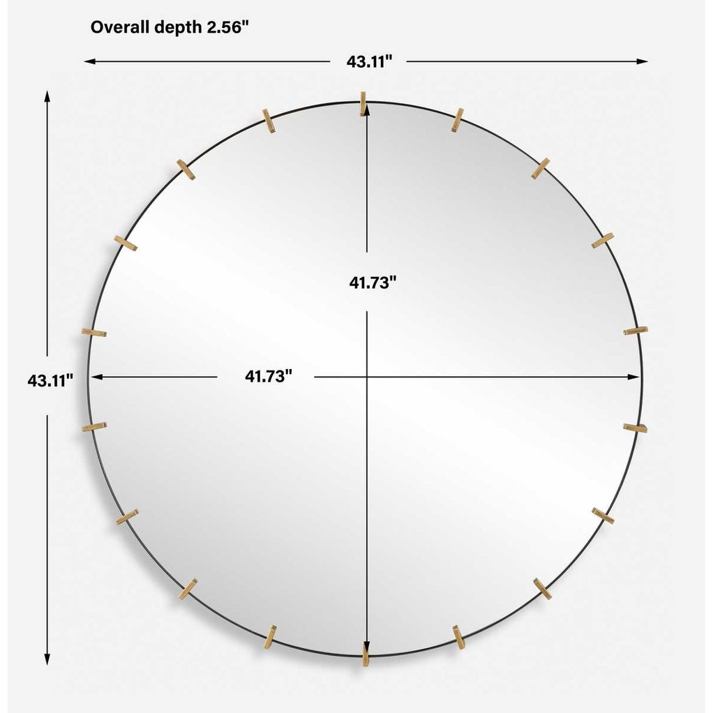 The Pali Round Mirror successfully pairs contemporary and industrial styles with a black iron strap frame accented by lightly antiqued brushed gold details, surrounding a floating polished edge mirror.