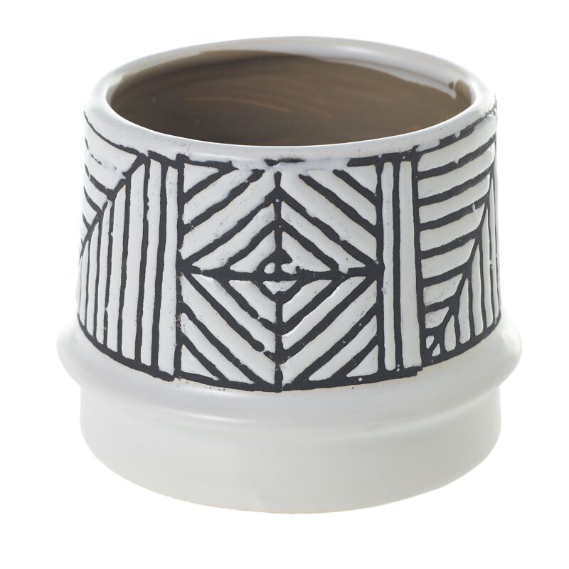 The Safaa Pot is hand-crafted from ceramic and features a stamped design and modern silhouette.