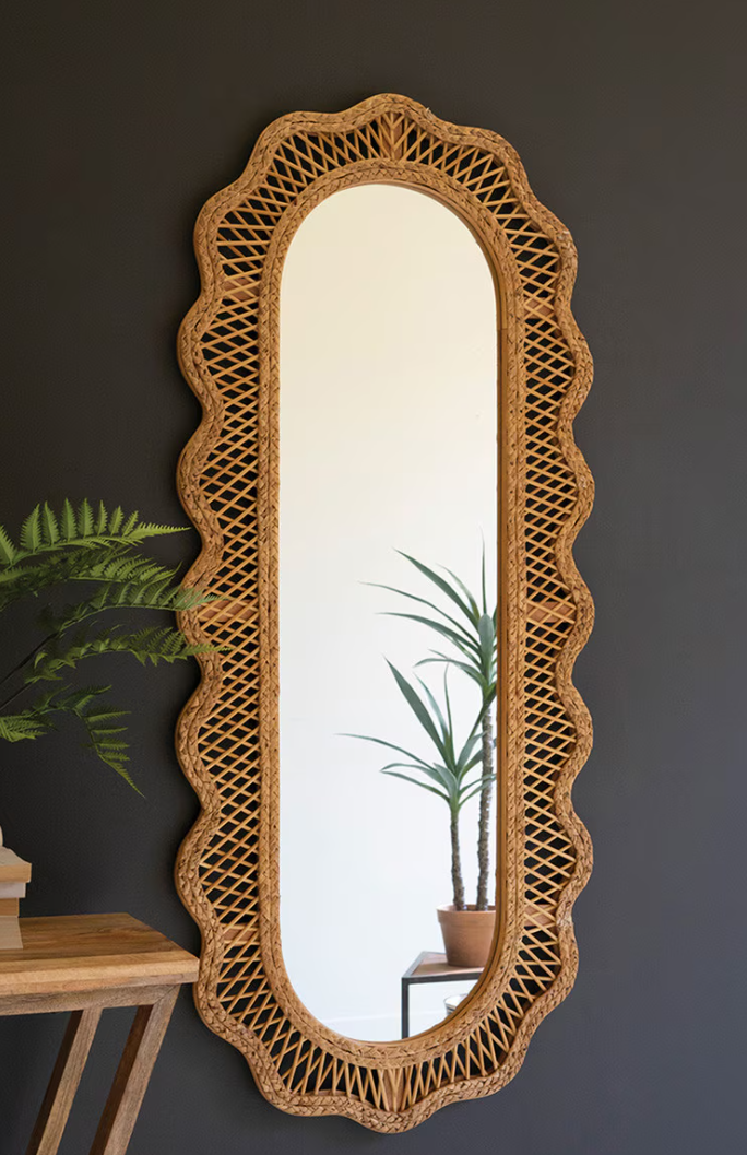 Make a stand-out statement with this oval rattan squiggle-framed mirror. The lustrous rattan stands out against a dark or light background and frames an oval mirror in a squiggle style. Perfect for a bedroom or dressing room space, this mirror shines in any environment.