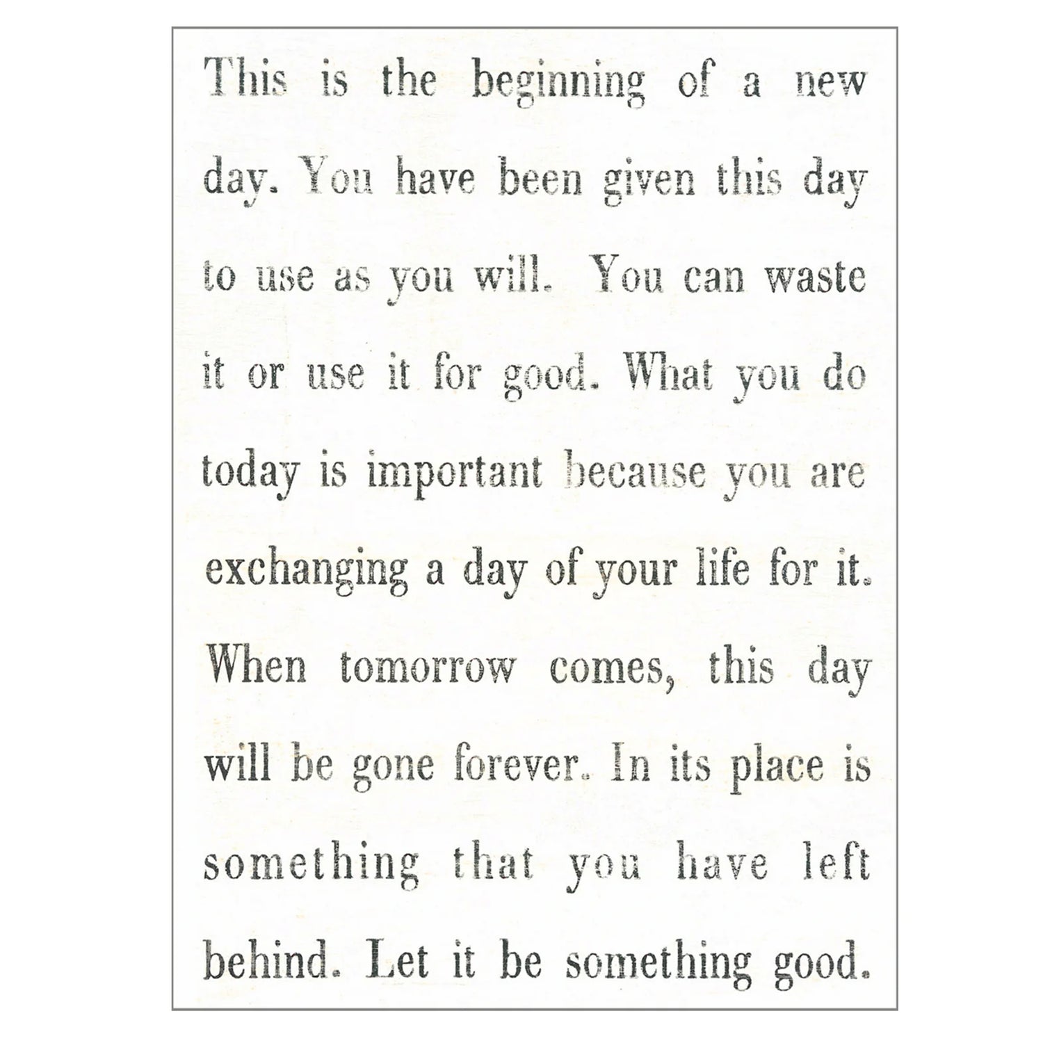 "This is the beginning of a new day. You have been given this day to use as you will. You can waste it or use it for good. What you do today is important because you are exchanging a day of your life for it. When tomorrow comes, this day will be gone forever. In its place is something that you have left behind. Let it be something good."